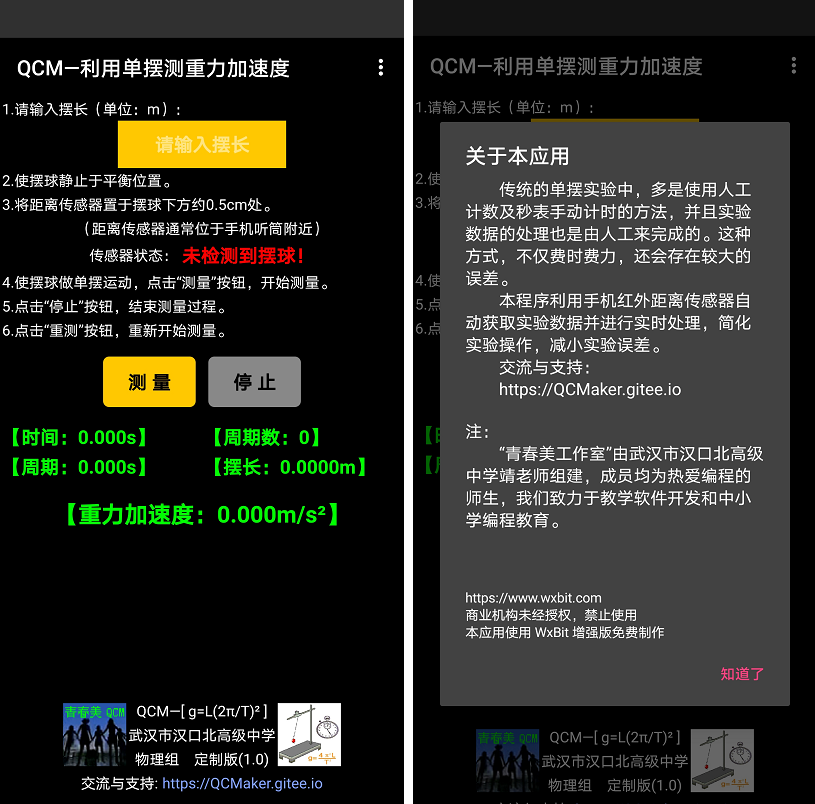 本程序利用手机或平板内置的“红外距离传感器”自动记录单摆摆动的周期数,利用手机内部时钟测量相应的总时间,并实时进行数据处理,简化实验操作,减小实验误差。