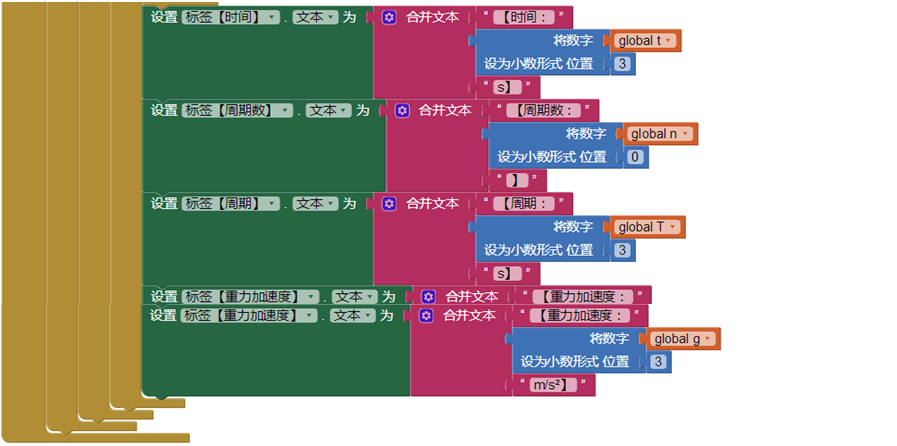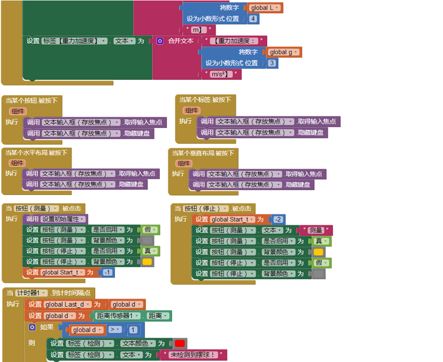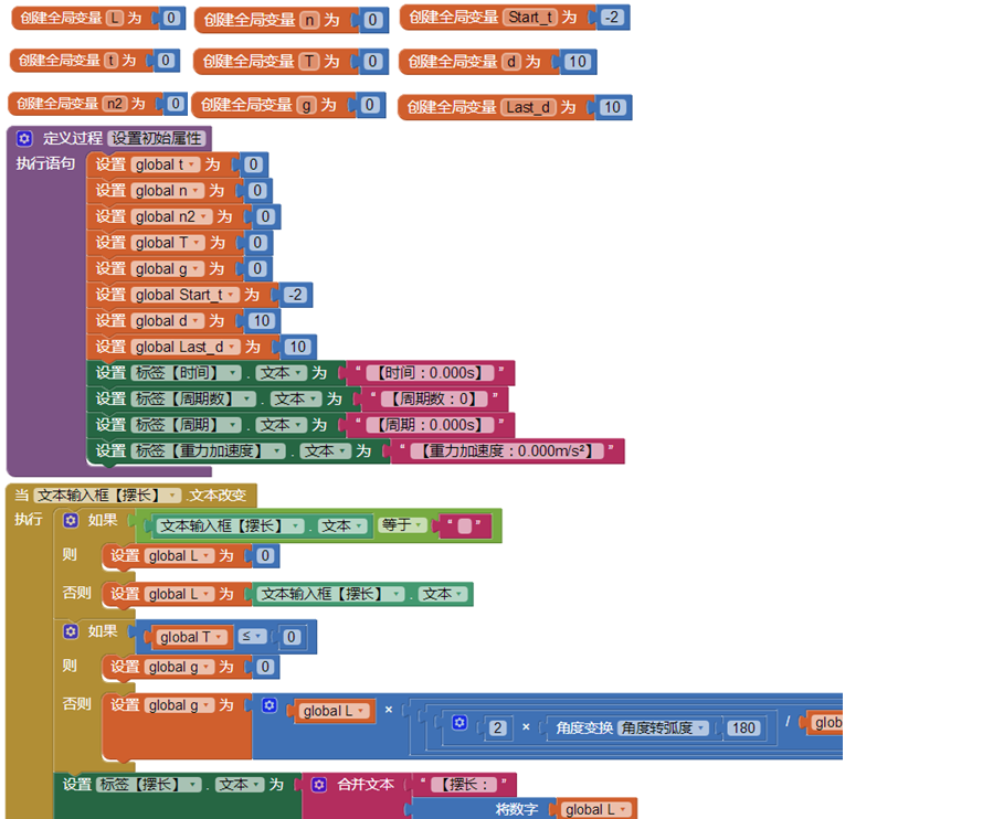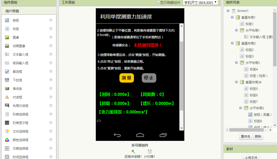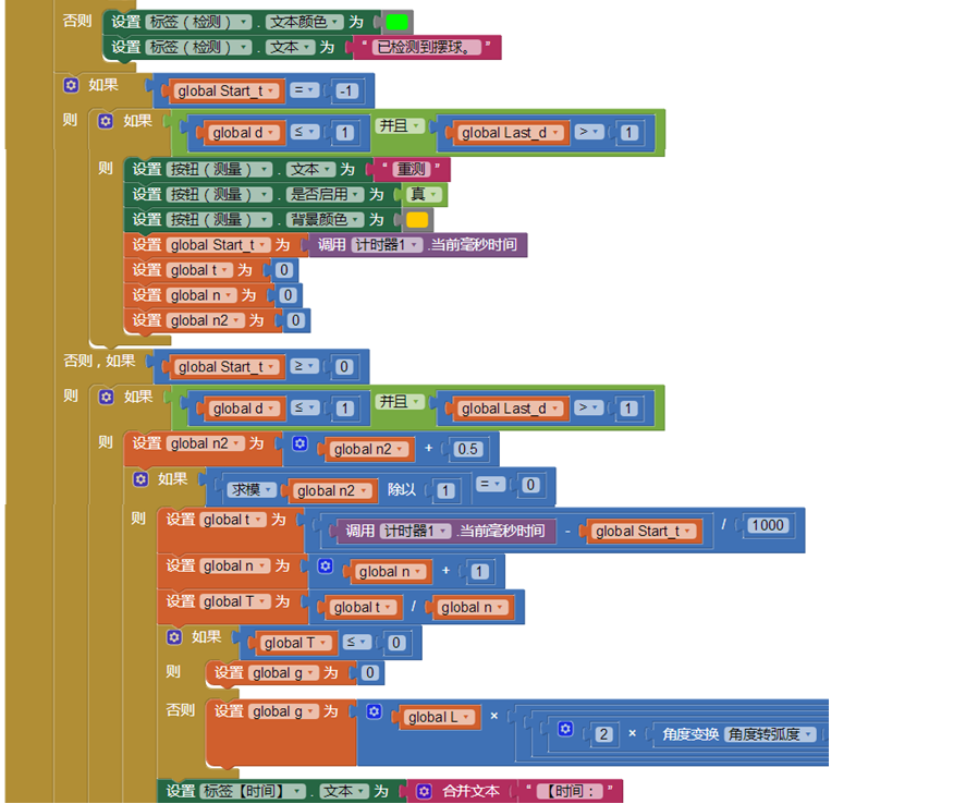 本程序基本原理是,利用手机红外距离传感器(通常是数字型,距离小于2cm返回0,大于2cm返回1),置于摆球摆动最低点的下方,感应摆球经过最低点的时间和次数,从而比较方便地获得摆球摆动的总时间和周期数。本程序部分代码如下:
