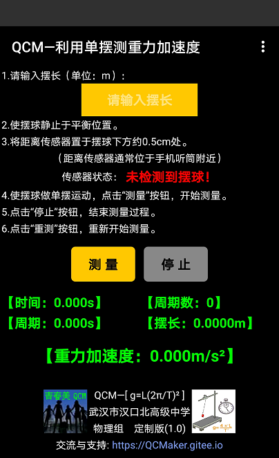 8.待摆球摆动稳定后,点击“测量”按钮,开始测量。此时手机屏幕将实时显示摆球摆动的总时间、周期数、周期以及按照单摆周期公式的变型式 [ g=L(2π/T)² ]计算出的当地重力加速度。